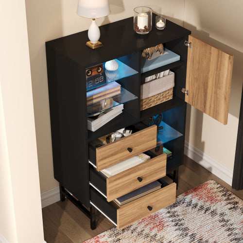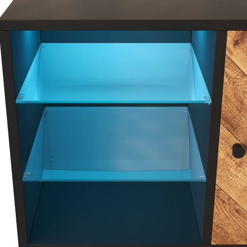 Vitrină cu LED 12 culori, dulap de bucătărie cu sertare și rafturi din sticlă, textură lemn triunghiulară, corp negru