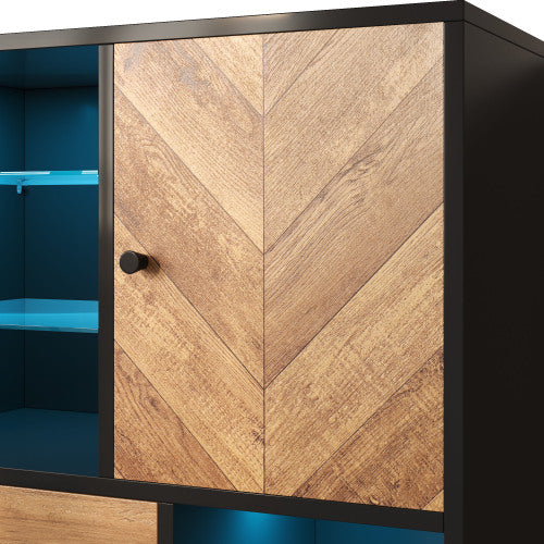 Design elegant și materiale de calitate: Combinația unică între textura lemnului și corpul elegant negru conferă vitrinei un farmec clasic cu un accent modern, îmbunătățind stilul oricărui living.